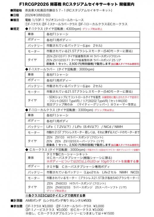 開催日2026年03月08日 2026F1RCGP開幕戦 18年目を迎えるF1RCGP開幕戦 レースインフォメーション レースインフォーメーション 開催クラスは下記の4クラスにて開催致します。 【F1クラス/F1ラバークラス/F1ローカルクラス/Cカークラス】 エントリーにつきましては明日(1月31日)より開始とさせて頂きます。 エントリーはこちらから ↓↓ https://ws.formzu.net/dist/S455353016/